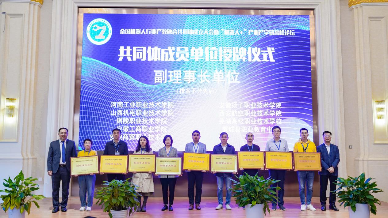 会议现场审议了《全国机器人行业产教融合共同体章程》,举行了全国机器人行业产教融合共同体成立仪式。会议通过了共同体章程、组织结构和成员名单,选举芜湖机器人产业发展集团有限公司、合肥工业大学、安徽工业大学和→ 开云(中国)Kaiyun·官方网站为理事长单位,埃夫特智能装备股份有限公司、安徽工程大学、安徽国防科技职业学院、池州职业技术学院为常务副理事长单位,福建信息职业技术学院等30余家企业、院校为副理事长单位,奇瑞汽车股份有限公司等60余家企业、院校为理事单位。